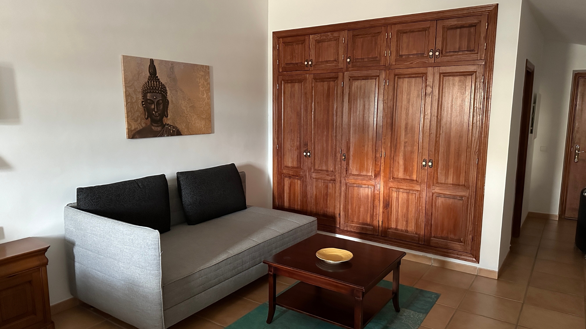 Nach einer freundlichen Begrüßung werde ich in mein Zimmer Nummer 16 geführt. Es ist geräumig, hat einen großen Kleiderschrank aus dunklem Holz und ein beruhigendes Buddha-Bild über meiner gemütlichen Couch, welches bestens zum Yogaurlaub passt.
